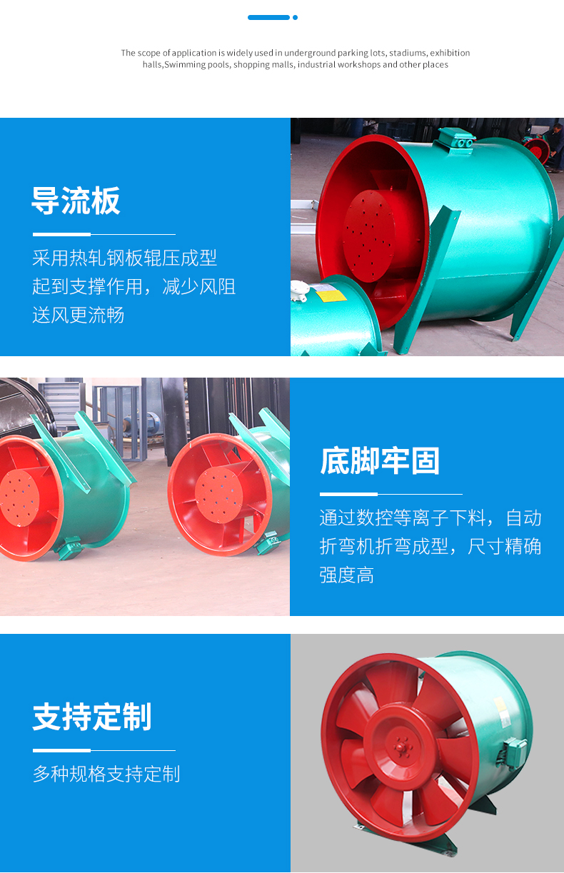 HTF型軸流式消防排煙風機,其基本形式為軸流式結構,電機采用耐高溫電機,產品按GA211-2009《消防排煙風機耐高溫試驗方法》進行耐高溫試驗,通過公安部消防產品合格評定中心消防產品認證,可在介質溫度280℃高溫條件下連續運轉60分鐘以上,100℃溫度條件下連續20小時/次不損壞,可通風、排煙兩用。