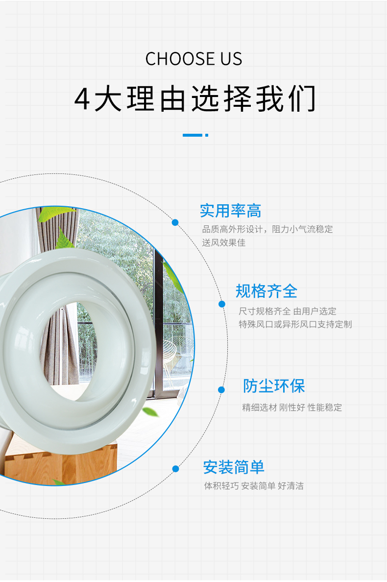 該風(fēng)口常用于管道中的吸、送風(fēng)用,同時(shí)可根據(jù)實(shí)際情況配上人字閘(多葉對(duì)開調(diào)節(jié)閥),用以控制風(fēng)量或安裝鋁合金過濾器,進(jìn)行配套使用。葉片可分為橫放和豎放兩種,可靈活的左右或者上下轉(zhuǎn)動(dòng),以控制氣流方向。