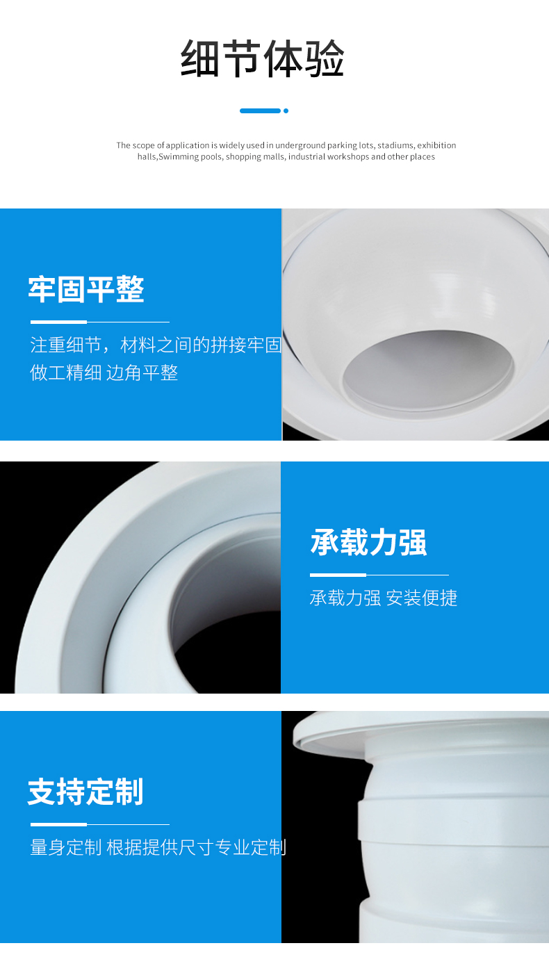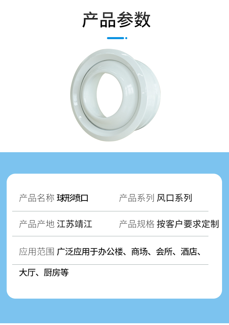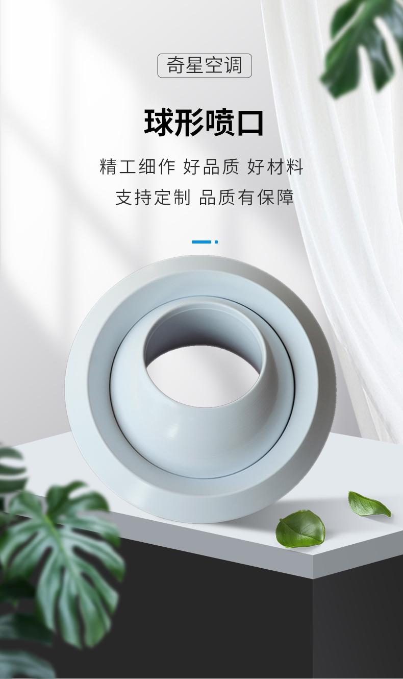 球形噴口的送風(fēng)噴嘴為球形,卡在外殼中,配有鋁制裝飾圈和可直接為圓插接的圓形接管,噴嘴可在30度左右范圍內(nèi)人工或電動(dòng)調(diào)節(jié)。主要用于音樂廳、劇場(chǎng)、博物館、電影院、飛機(jī)場(chǎng)、高鐵站等空調(diào)送風(fēng)與人員活動(dòng)范圍有較大距離的環(huán)境中。